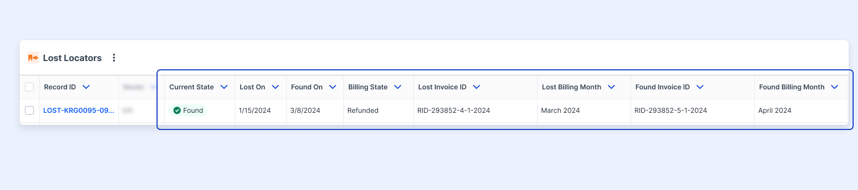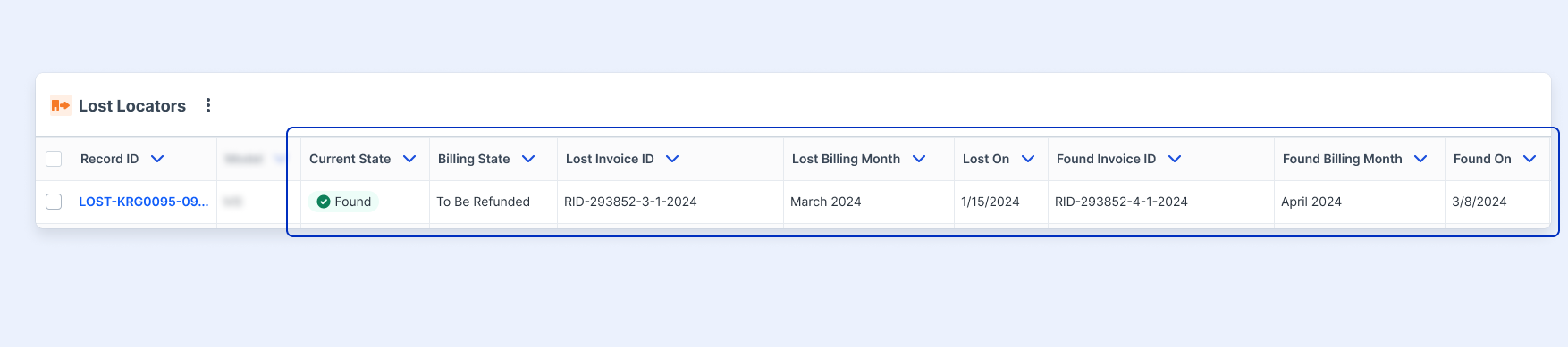 For example, a Locator lost on January 15th was charged in the February invoice (that is generated on 3/1). However, if that lost Locator were found on March 8th, a credit will be added to the March invoice (that is generated on 4/1) and the record will be marked as “Found - To Be Refunded” until that invoice is generated.